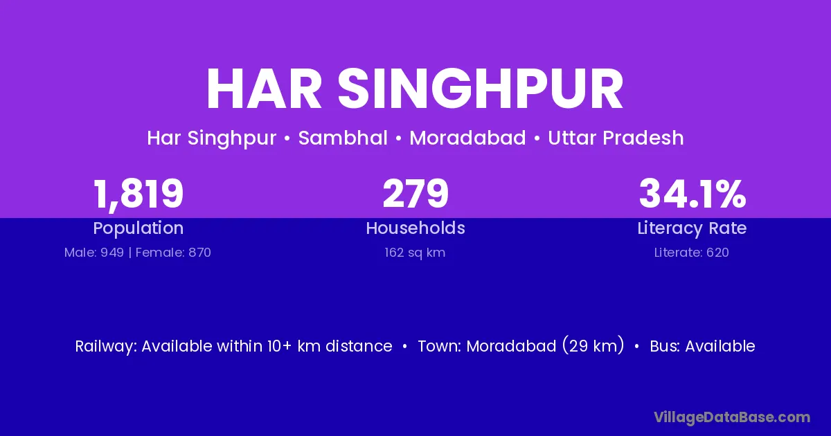 Moradabad (29 km) is the nearest town to Har Singhpur village for major economic activities and is located approximately 29 km away.