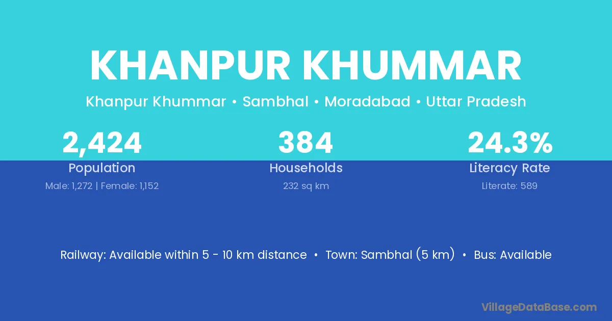 Sambhal (5 km) is the nearest town to Khanpur Khummar village for major economic activities and is located approximately 5 km away.
