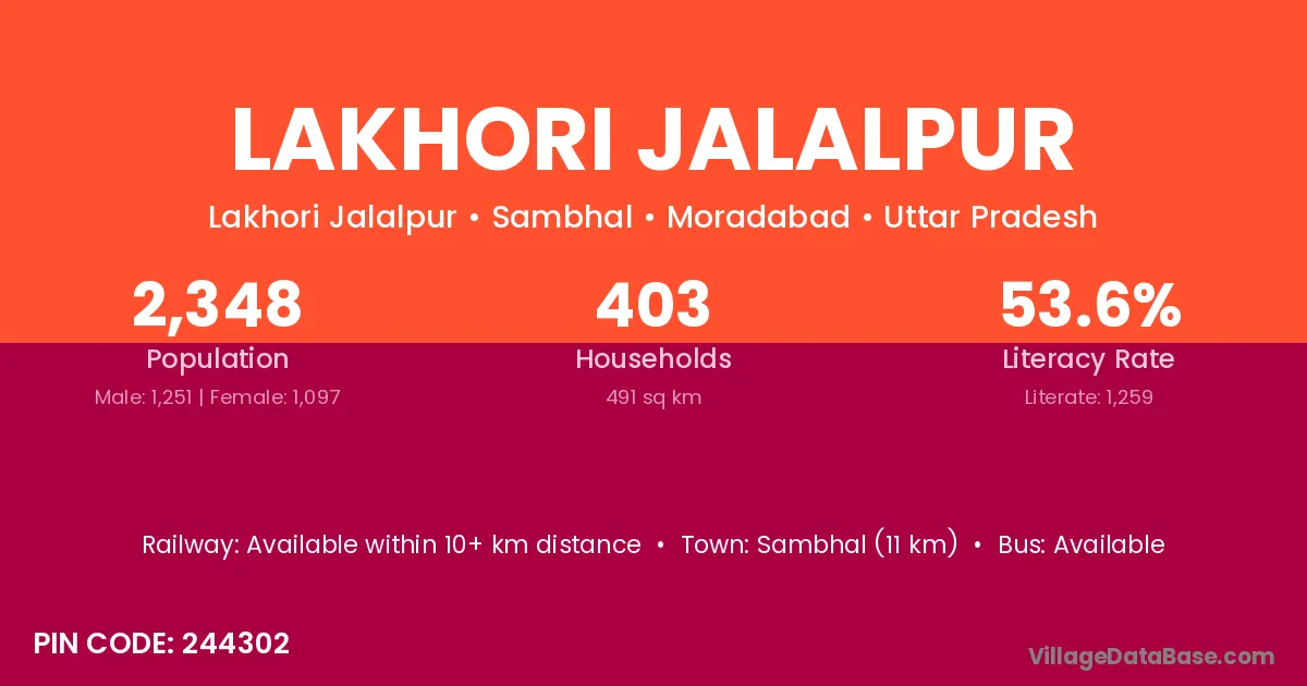 Sambhal (11 km) is the nearest town to Lakhori Jalalpur village for major economic activities and is located approximately 11 km away.