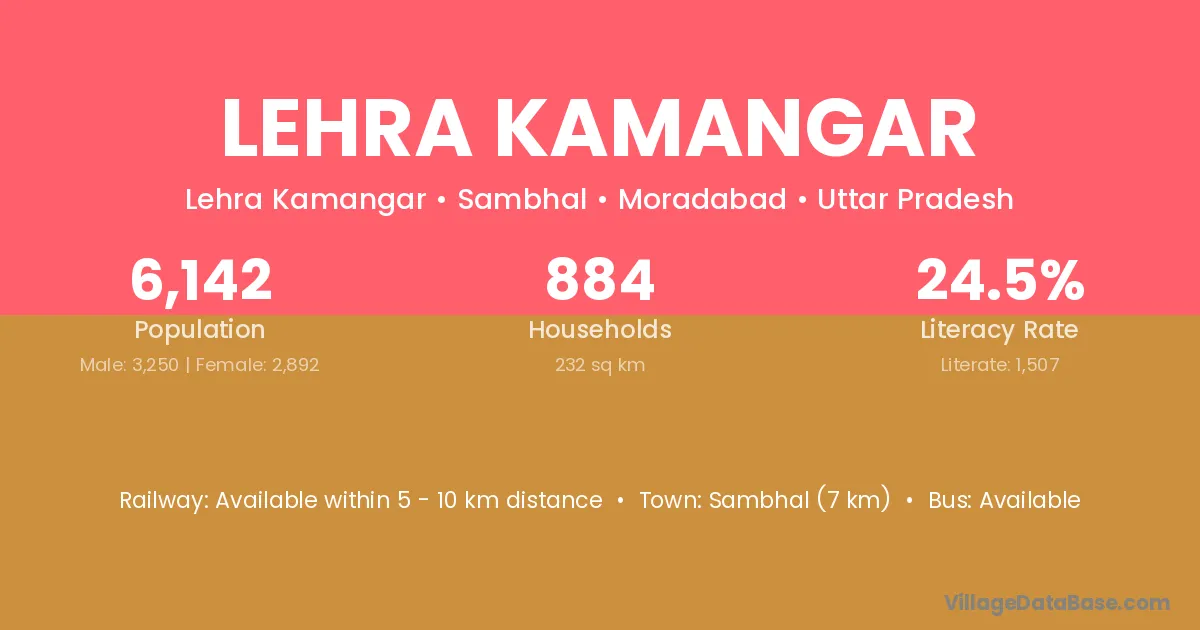Sambhal (7 km) is the nearest town to Lehra Kamangar village for major economic activities and is located approximately 7 km away.