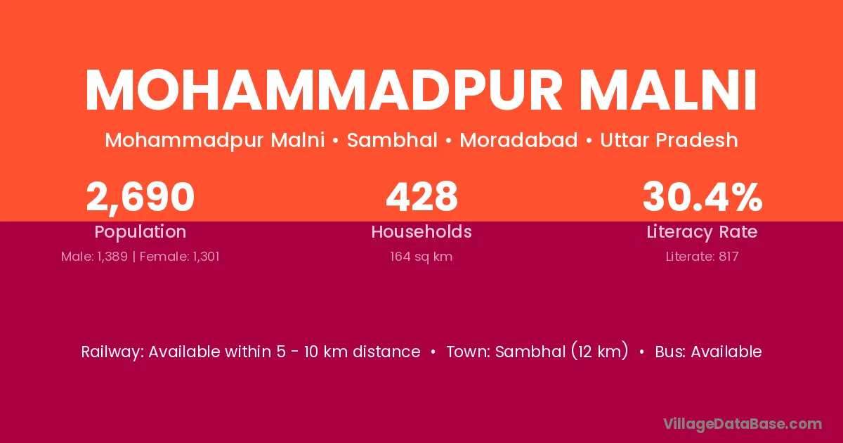 Sambhal (12 km) is the nearest town to Mohammadpur Malni village for major economic activities and is located approximately 12 km away.