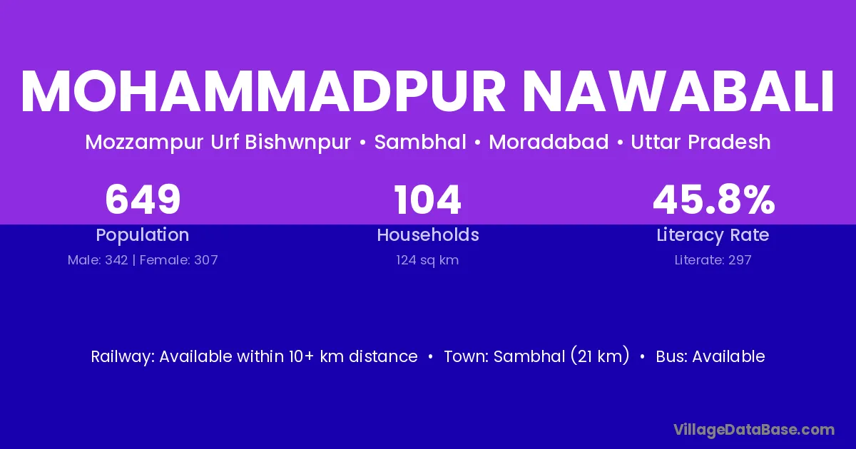 Sambhal (21 km) is the nearest town to Mohammadpur Nawabali village for major economic activities and is located approximately 21 km away.