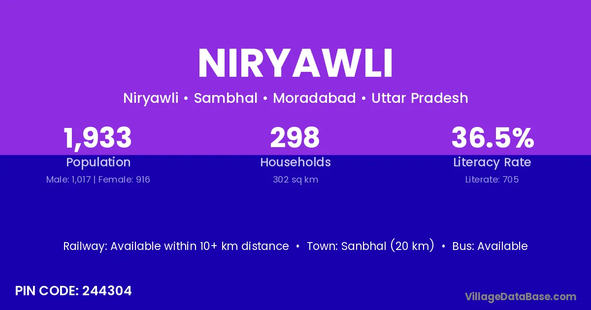 Sanbhal (20 km) is the nearest town to Niryawli village for major economic activities and is located approximately 20 km away.