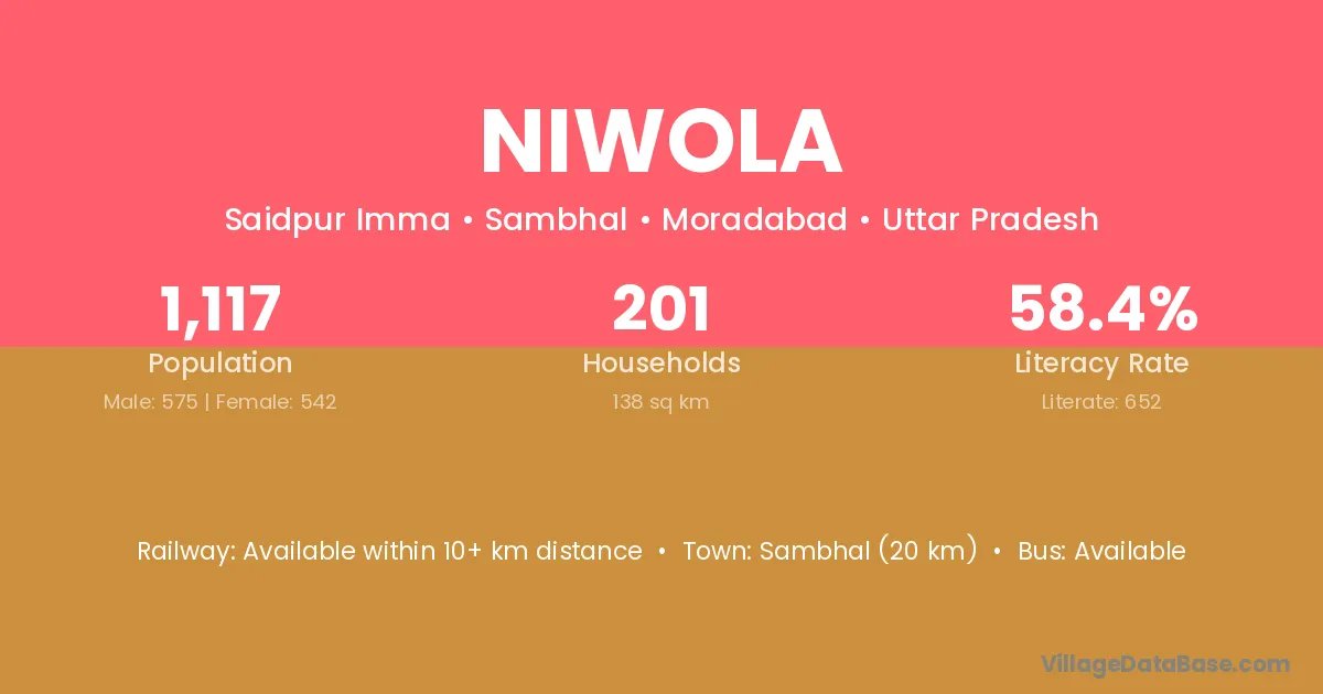 Sambhal (20 km) is the nearest town to Niwola village for major economic activities and is located approximately 20 km away.