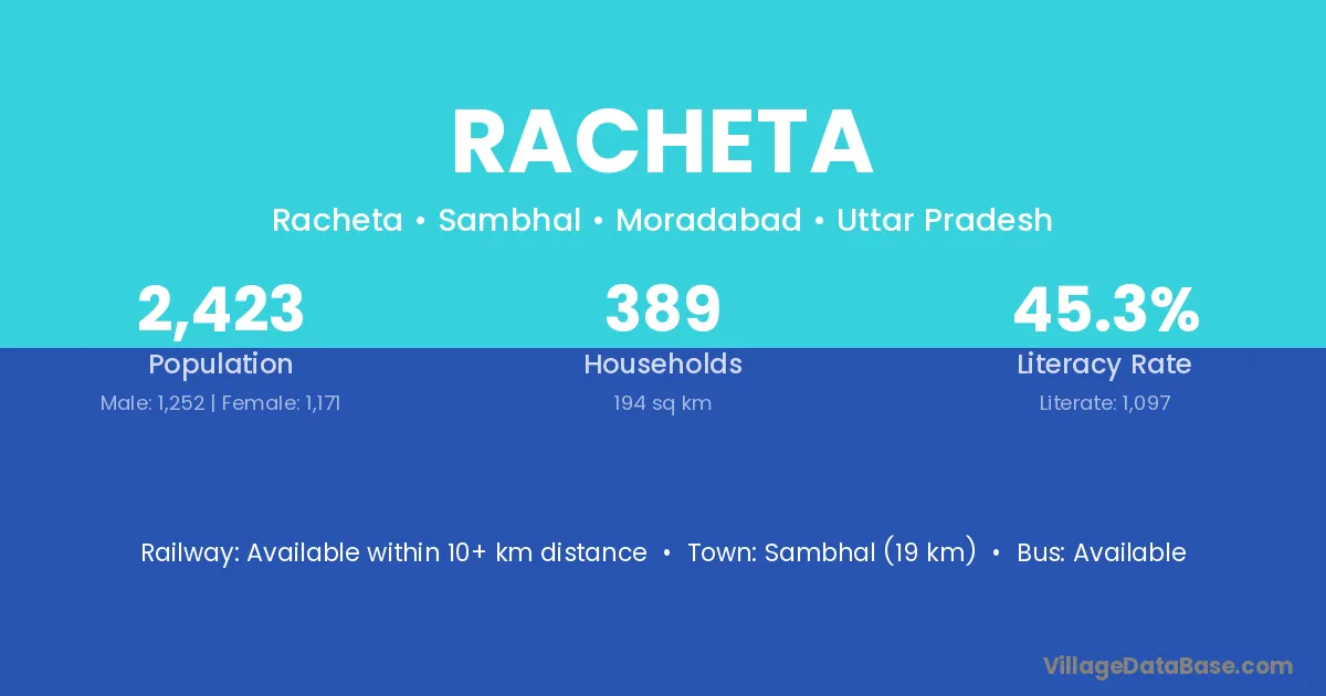 Sambhal (19 km) is the nearest town to Racheta village for major economic activities and is located approximately 19 km away.