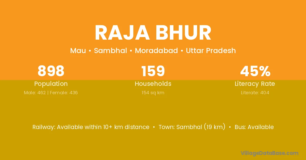 Sambhal (19 km) is the nearest town to Raja Bhur village for major economic activities and is located approximately 19 km away.