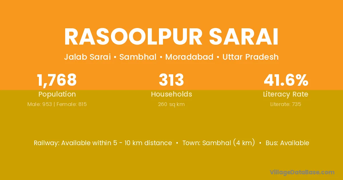 Sambhal (4 km) is the nearest town to Rasoolpur Sarai village for major economic activities and is located approximately 4 km away.