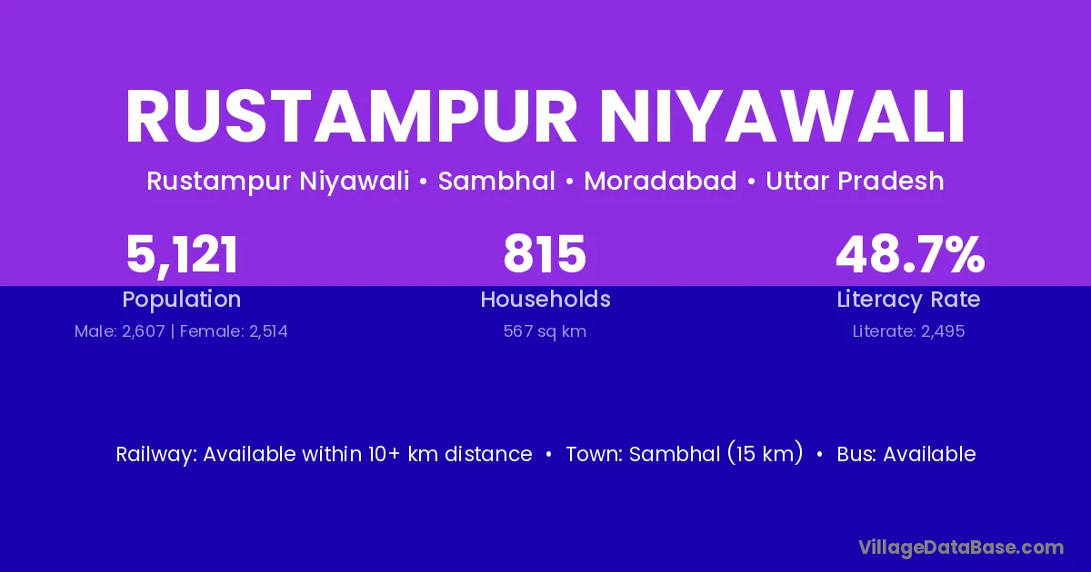 Sambhal (15 km) is the nearest town to Rustampur Niyawali village for major economic activities and is located approximately 15 km away.