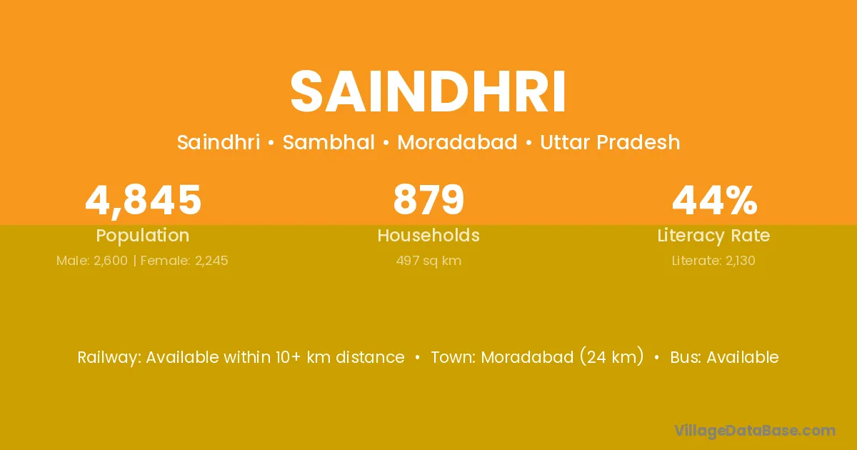 Moradabad (24 km) is the nearest town to Saindhri village for major economic activities and is located approximately 24 km away.