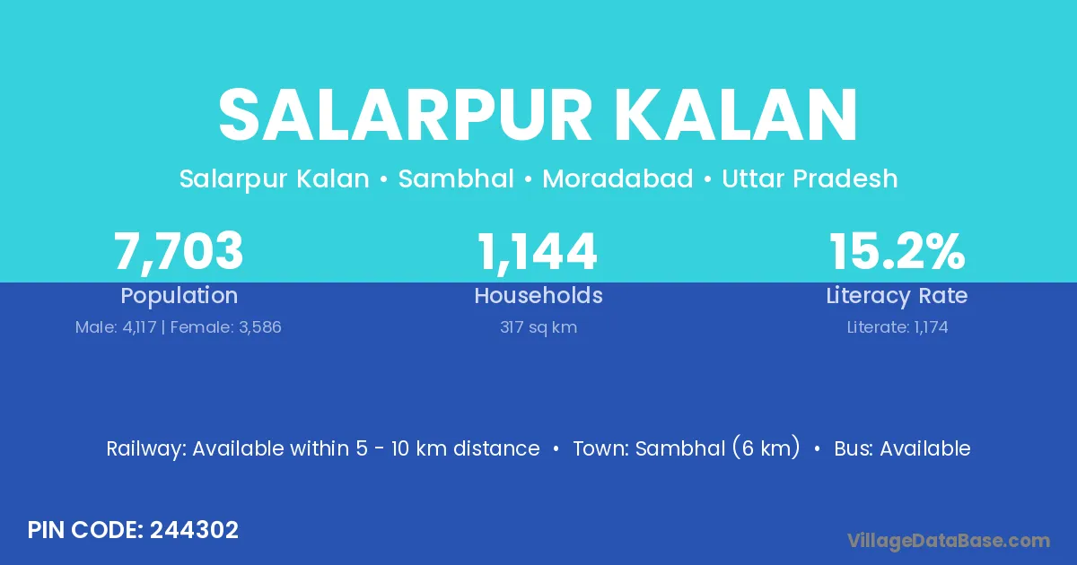 Sambhal (6 km) is the nearest town to Salarpur Kalan village for major economic activities and is located approximately 6 km away.