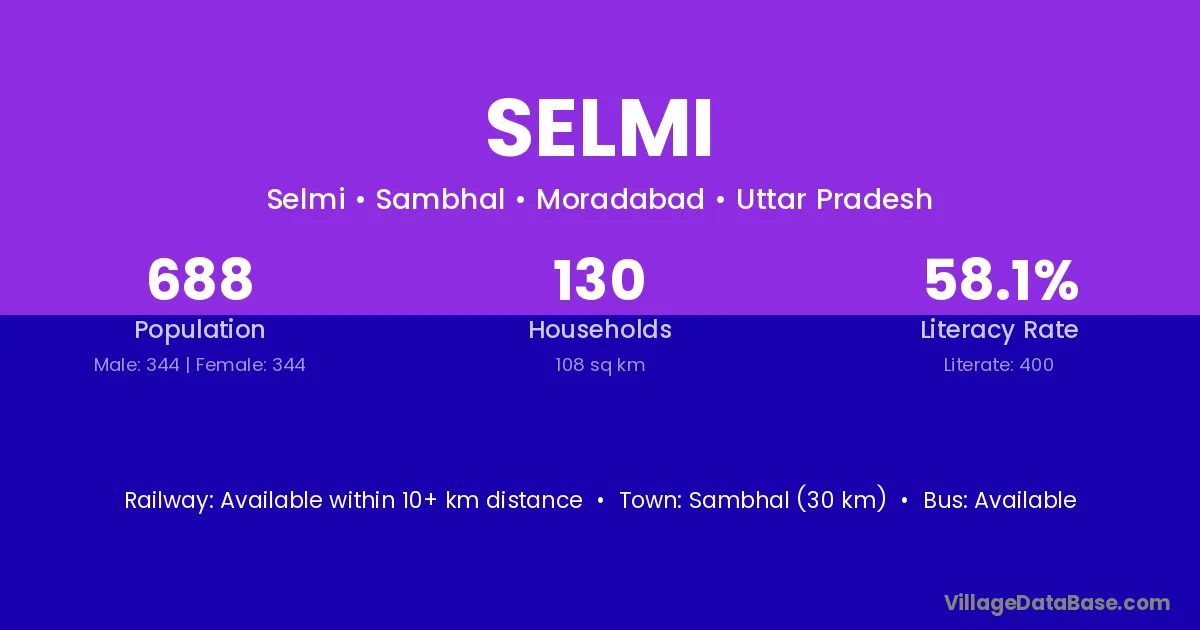 Sambhal (30 km) is the nearest town to Selmi village for major economic activities and is located approximately 30 km away.