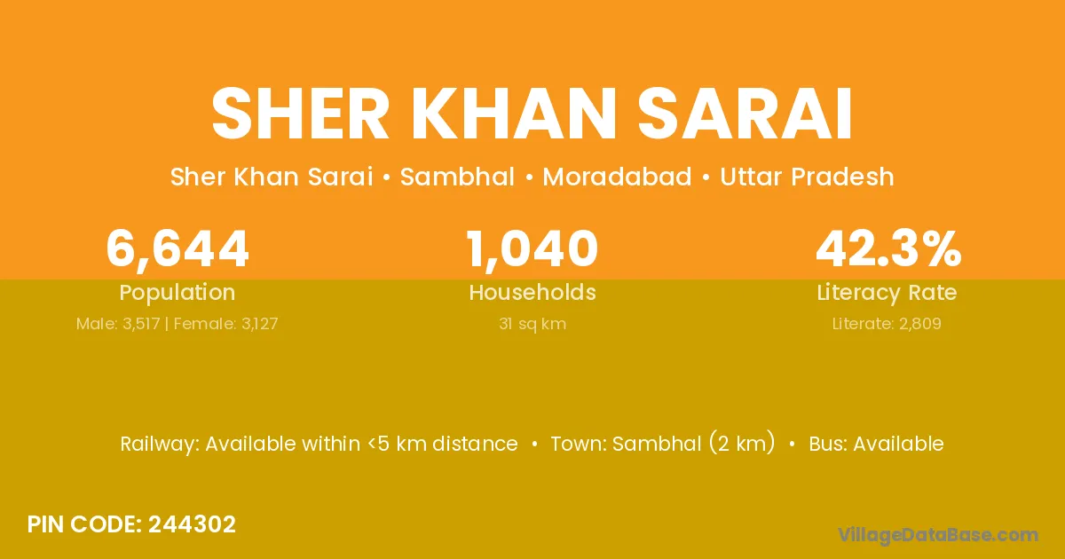 Sambhal (2 km) is the nearest town to Sher Khan Sarai village for major economic activities and is located approximately 2 km away.