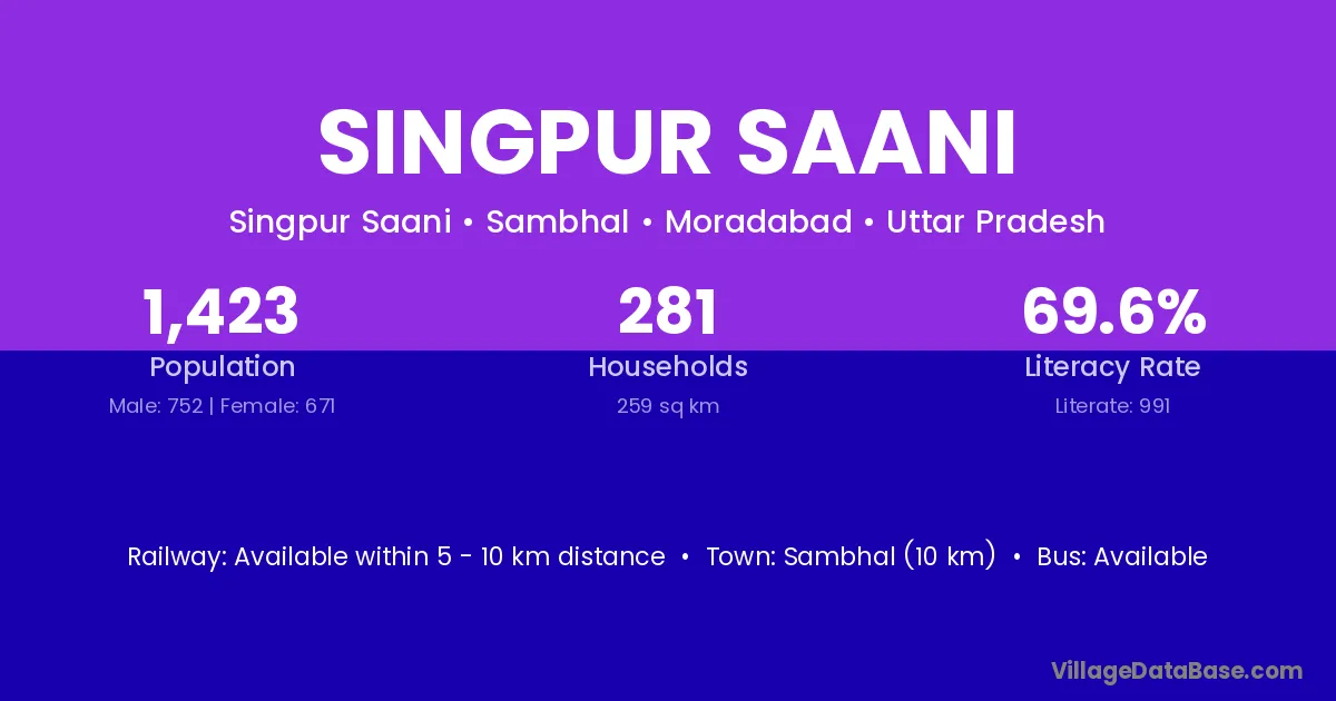Sambhal (10 km) is the nearest town to Singpur Saani village for major economic activities and is located approximately 10 km away.