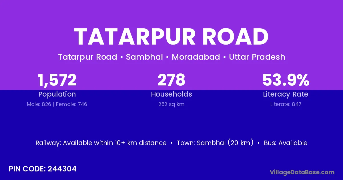 Sambhal (20 km) is the nearest town to Tatarpur Road village for major economic activities and is located approximately 20 km away.