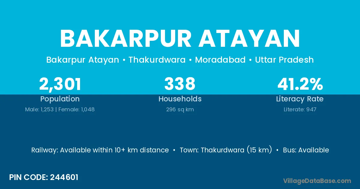 Thakurdwara (15 km) is the nearest town to Bakarpur Atayan village for major economic activities and is located approximately 15 km away.