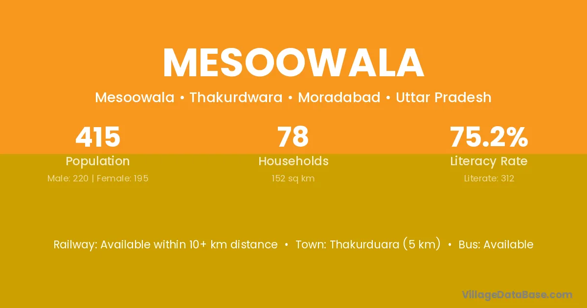 Mesoowala village has a total population of 415 people, of which 220 are males and 195 are females.