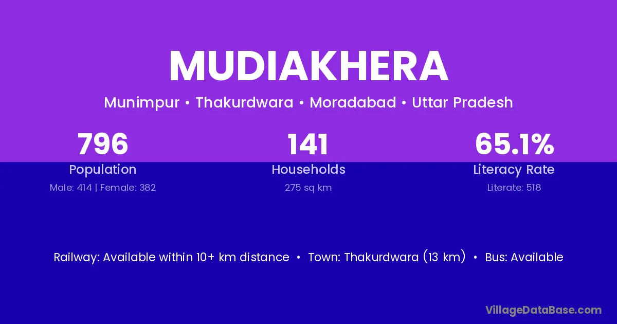 Thakurdwara (13 km) is the nearest town to Mudiakhera village for major economic activities and is located approximately 13 km away.