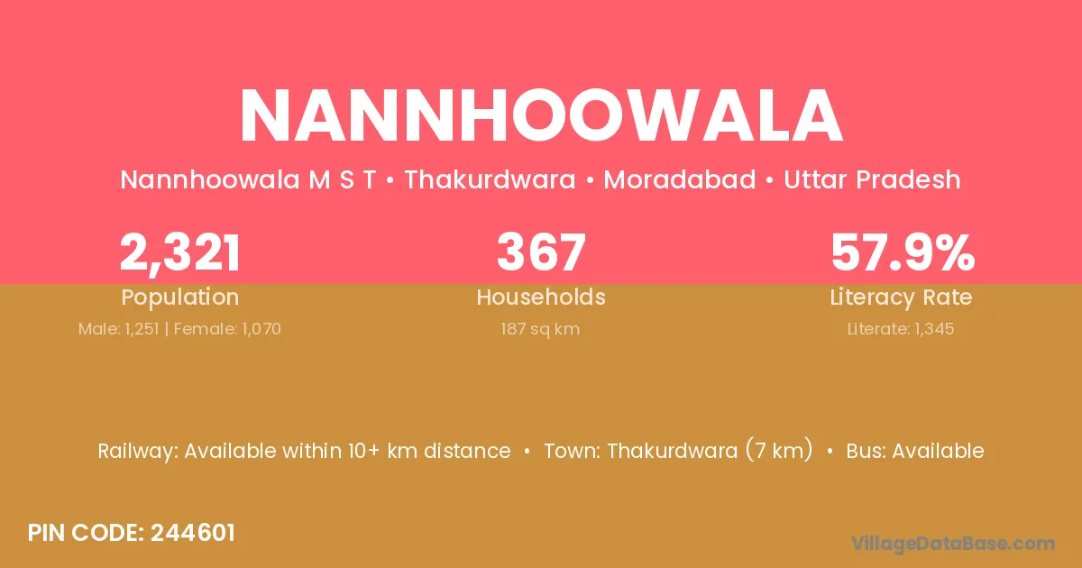 Thakurdwara (7 km) is the nearest town to Nannhoowala village for major economic activities and is located approximately 7 km away.