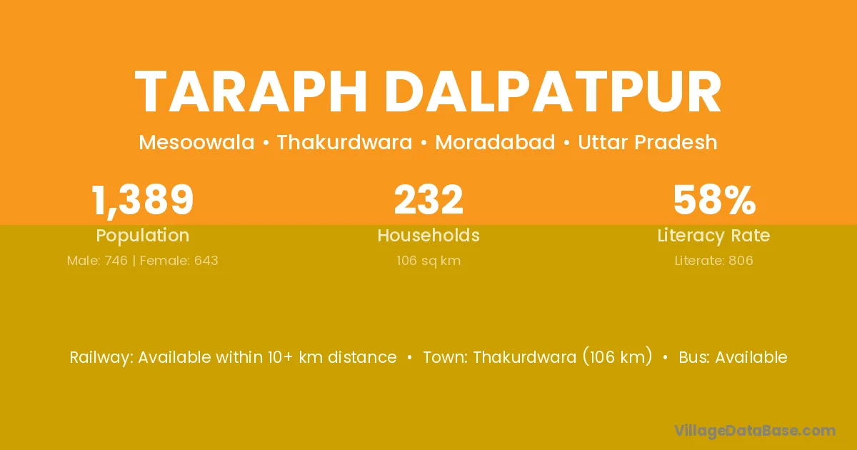 Thakurdwara (106 km) is the nearest town to Taraph Dalpatpur village for major economic activities and is located approximately 106 km away.