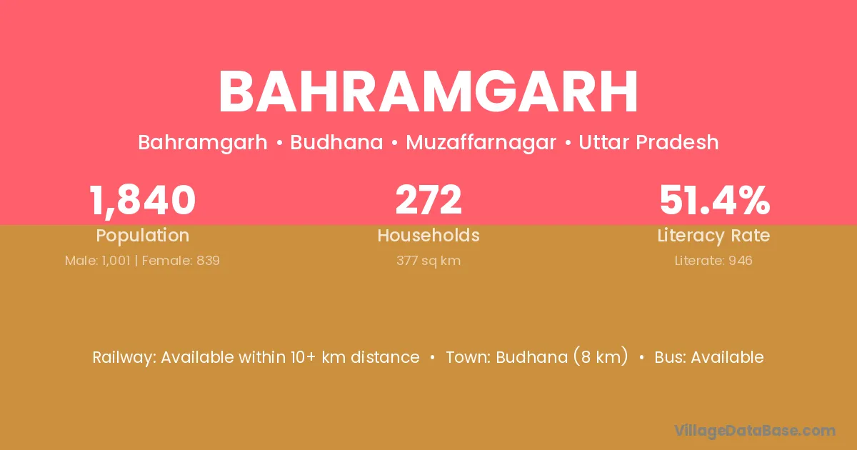 Budhana (8 km) is the nearest town to Bahramgarh village for major economic activities and is located approximately 8 km away.