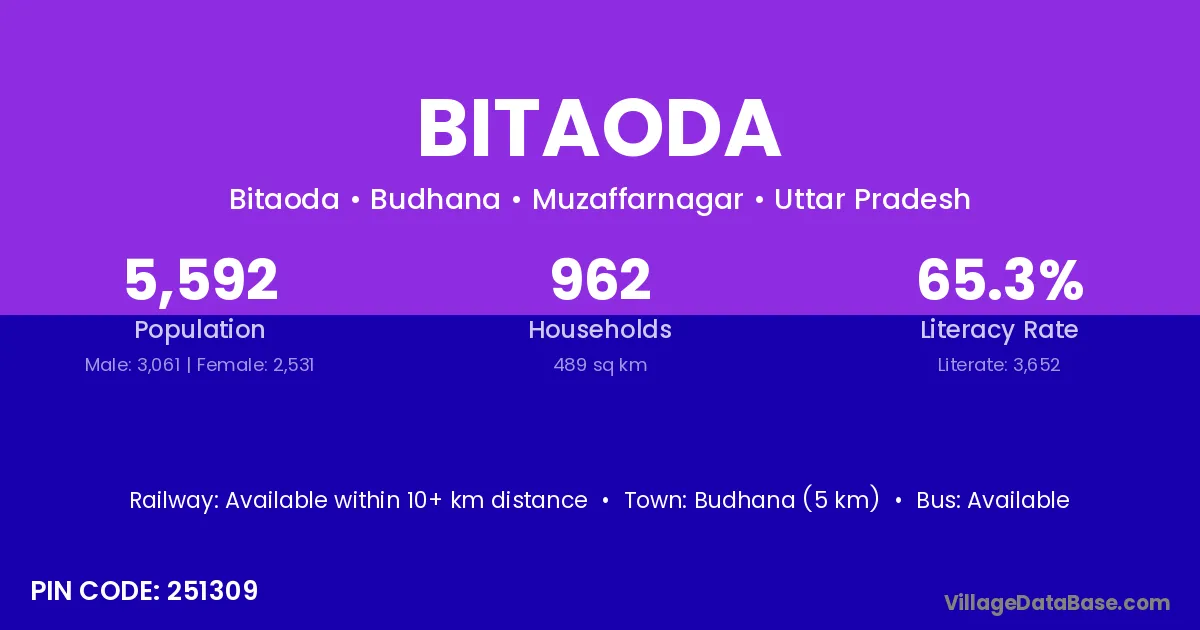 Budhana (5 km) is the nearest town to Bitaoda village for major economic activities and is located approximately 5 km away.