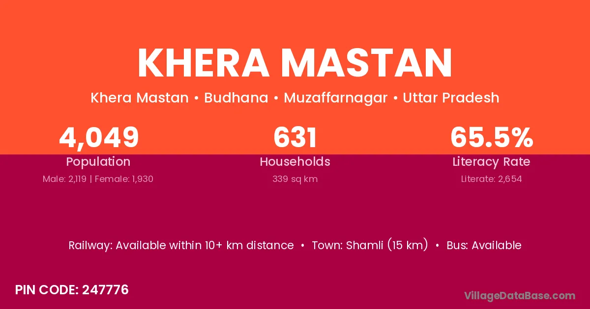 Shamli (15 km) is the nearest town to Khera Mastan village for major economic activities and is located approximately 15 km away.