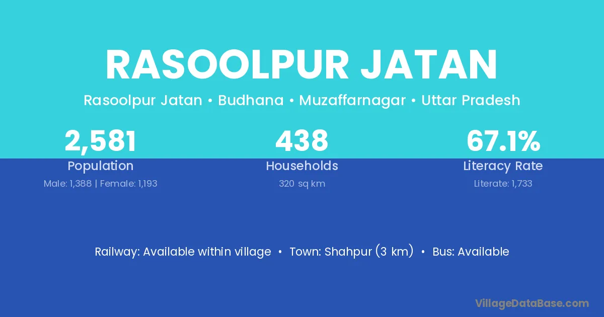 Rasoolpur Jatan village has a total population of 2,581 people, of which 1,388 are males and 1,193 are females.