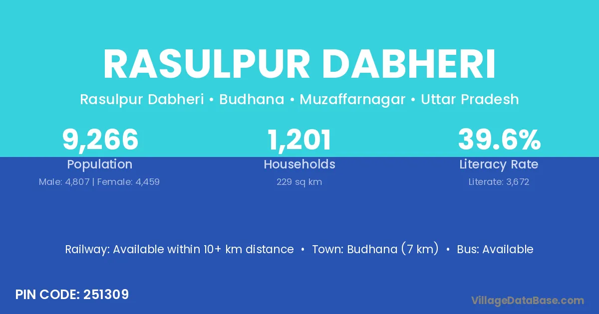Budhana (7 km) is the nearest town to Rasulpur Dabheri village for major economic activities and is located approximately 7 km away.