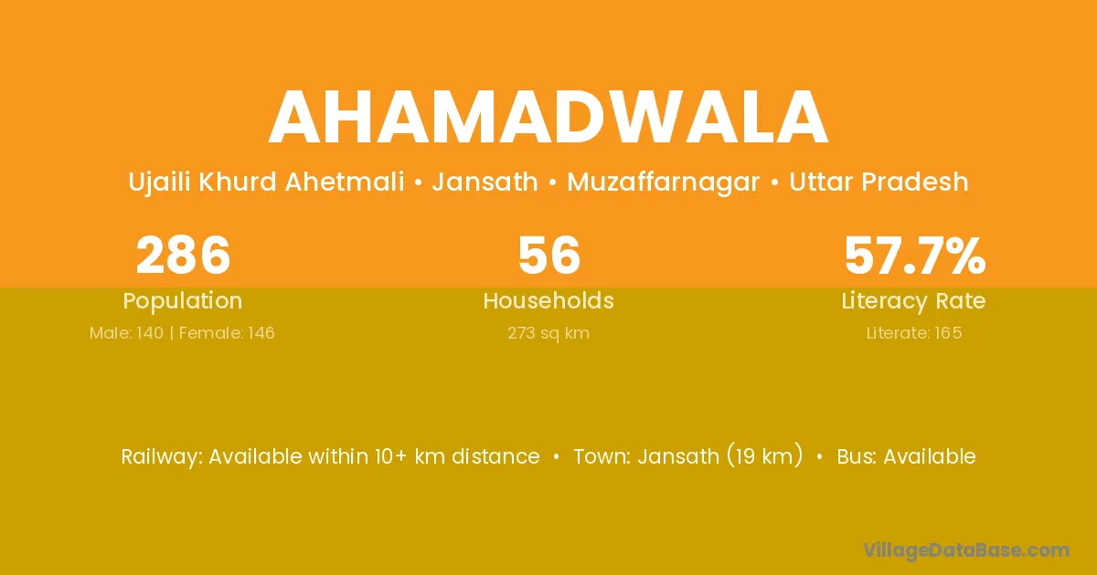 Jansath (19 km) is the nearest town to Ahamadwala village for major economic activities and is located approximately 19 km away.