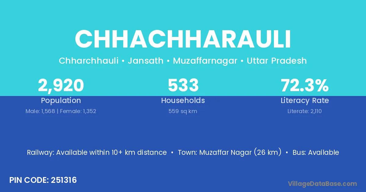 Muzaffar Nagar (26 km) is the nearest town to Chhachharauli village for major economic activities and is located approximately 26 km away.