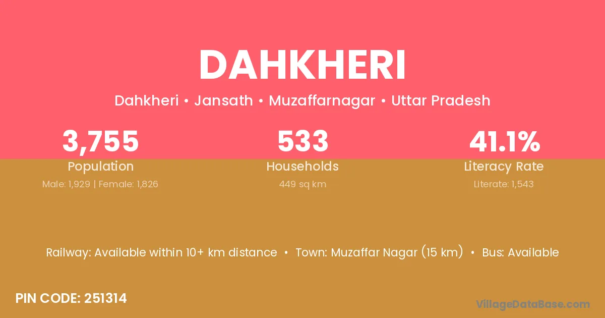 Muzaffar Nagar (15 km) is the nearest town to Dahkheri village for major economic activities and is located approximately 15 km away.