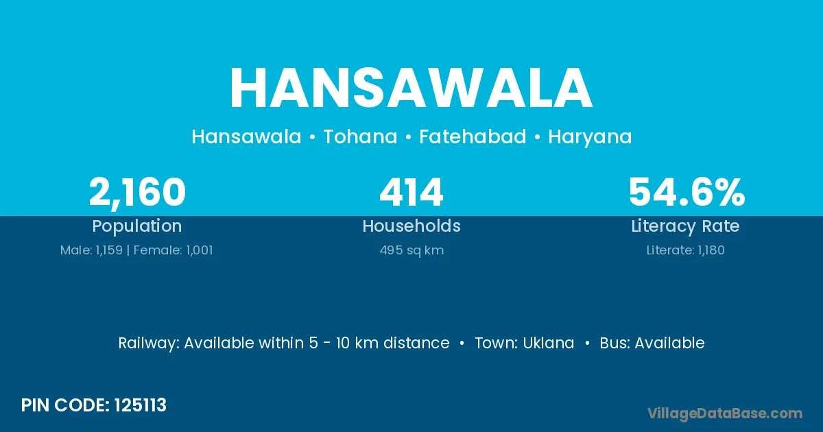 The literacy rate of Hansawala village is 54.50%. Male literacy stands at 66.34% and female literacy at 41.18%.