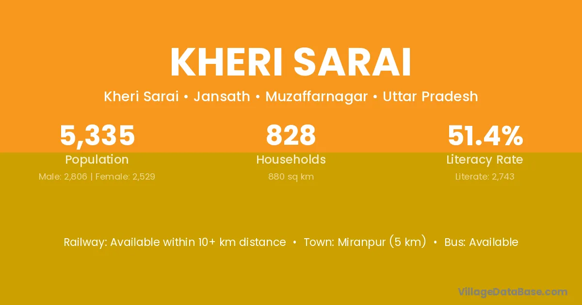 Miranpur (5 km) is the nearest town to Kheri Sarai village for major economic activities and is located approximately 5 km away.