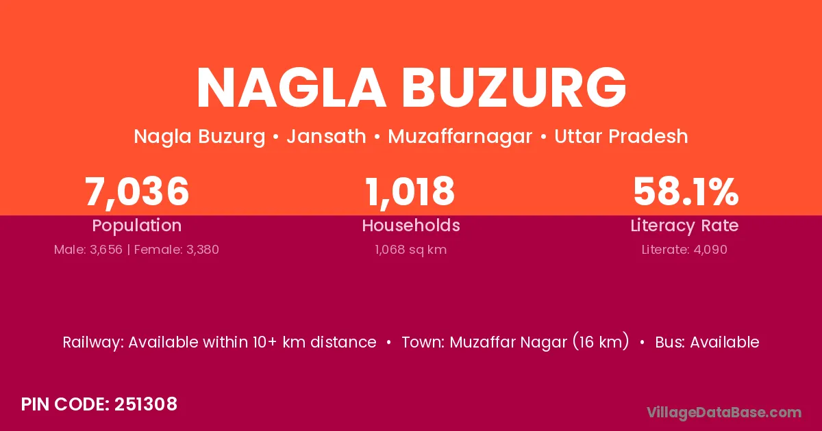 Muzaffar Nagar (16 km) is the nearest town to Nagla Buzurg village for major economic activities and is located approximately 16 km away.
