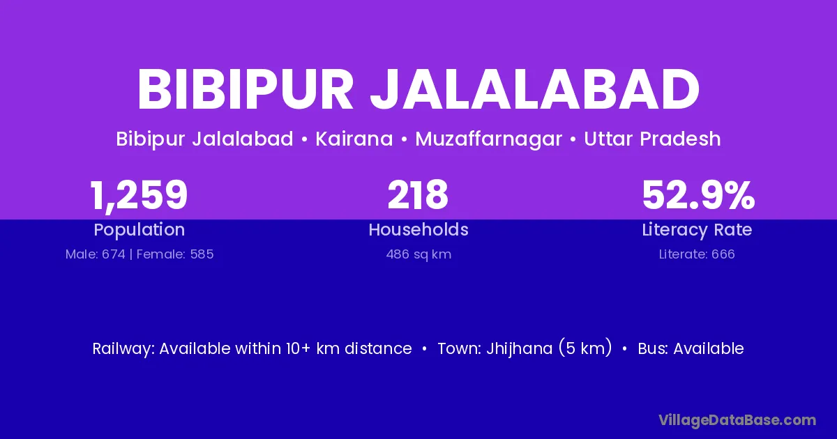 Bibipur Jalalabad village has a total population of 1,259 people, of which 674 are males and 585 are females.
