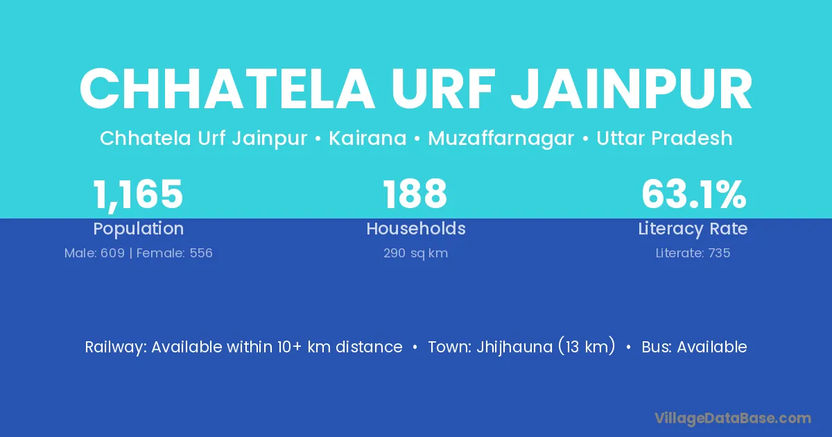 Jhijhauna (13 km) is the nearest town to Chhatela Urf Jainpur village for major economic activities and is located approximately 13 km away.
