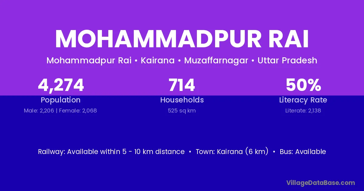 Kairana (6 km) is the nearest town to Mohammadpur Rai village for major economic activities and is located approximately 6 km away.