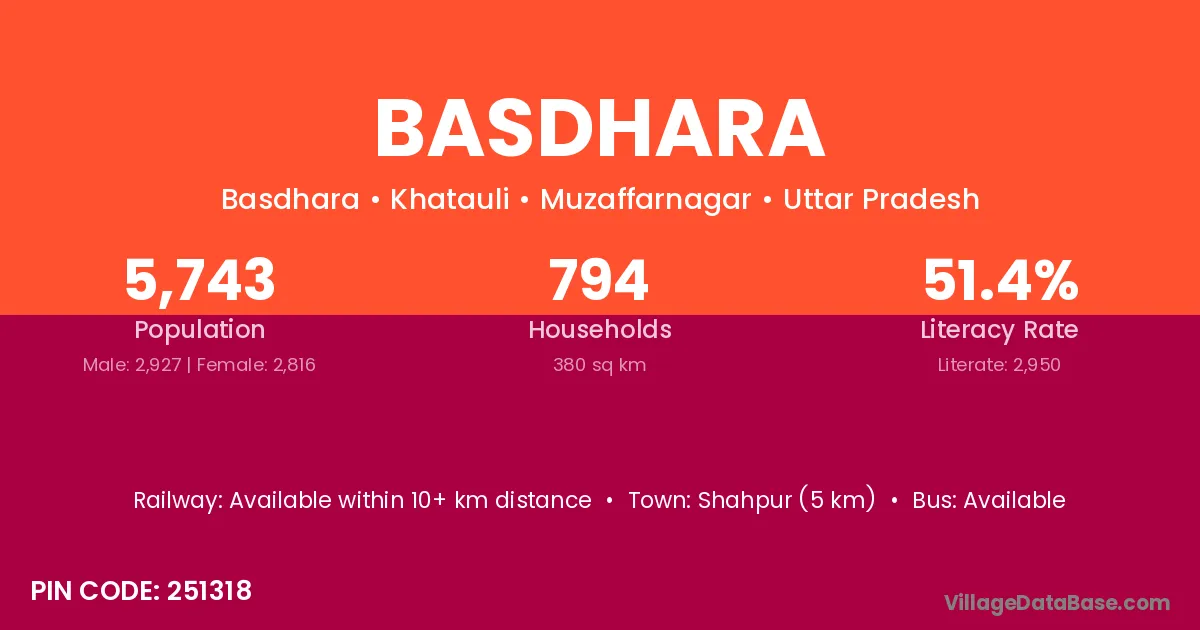 Basdhara village has a total population of 5,743 people, of which 2,927 are males and 2,816 are females.