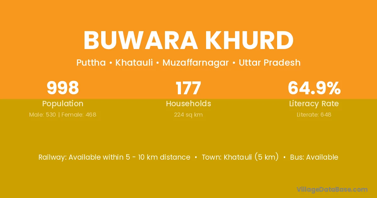 Khatauli (5 km) is the nearest town to Buwara Khurd village for major economic activities and is located approximately 5 km away.