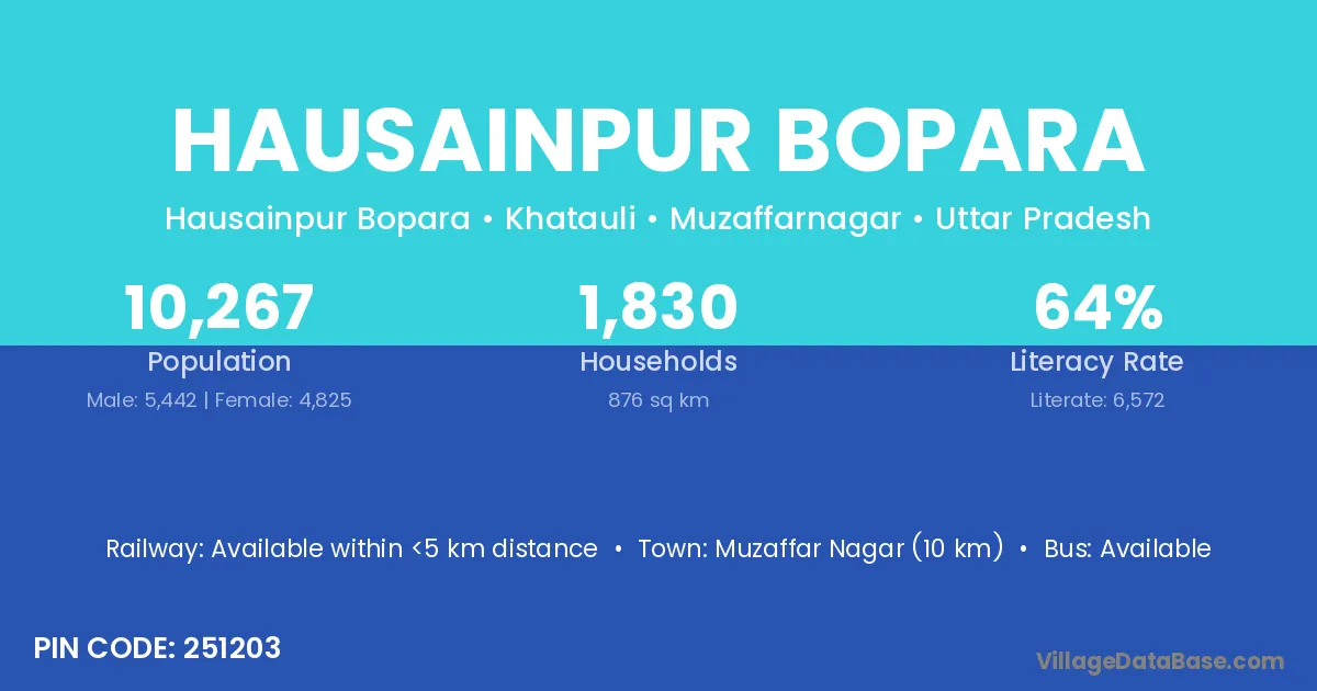Muzaffar Nagar (10 km) is the nearest town to Hausainpur Bopara village for major economic activities and is located approximately 10 km away.