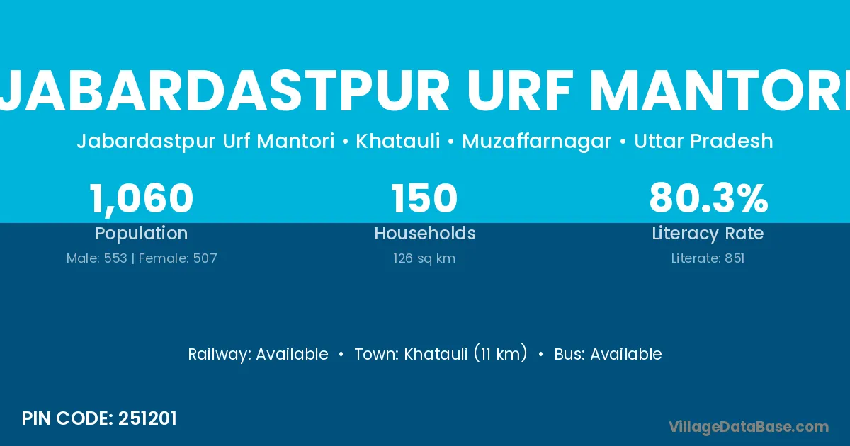Khatauli (11 km) is the nearest town to Jabardastpur Urf Mantori village for major economic activities and is located approximately 11 km away.