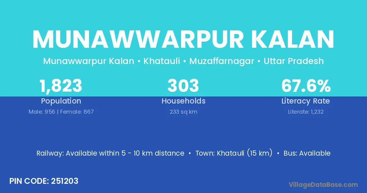 Khatauli (15 km) is the nearest town to Munawwarpur Kalan village for major economic activities and is located approximately 15 km away.