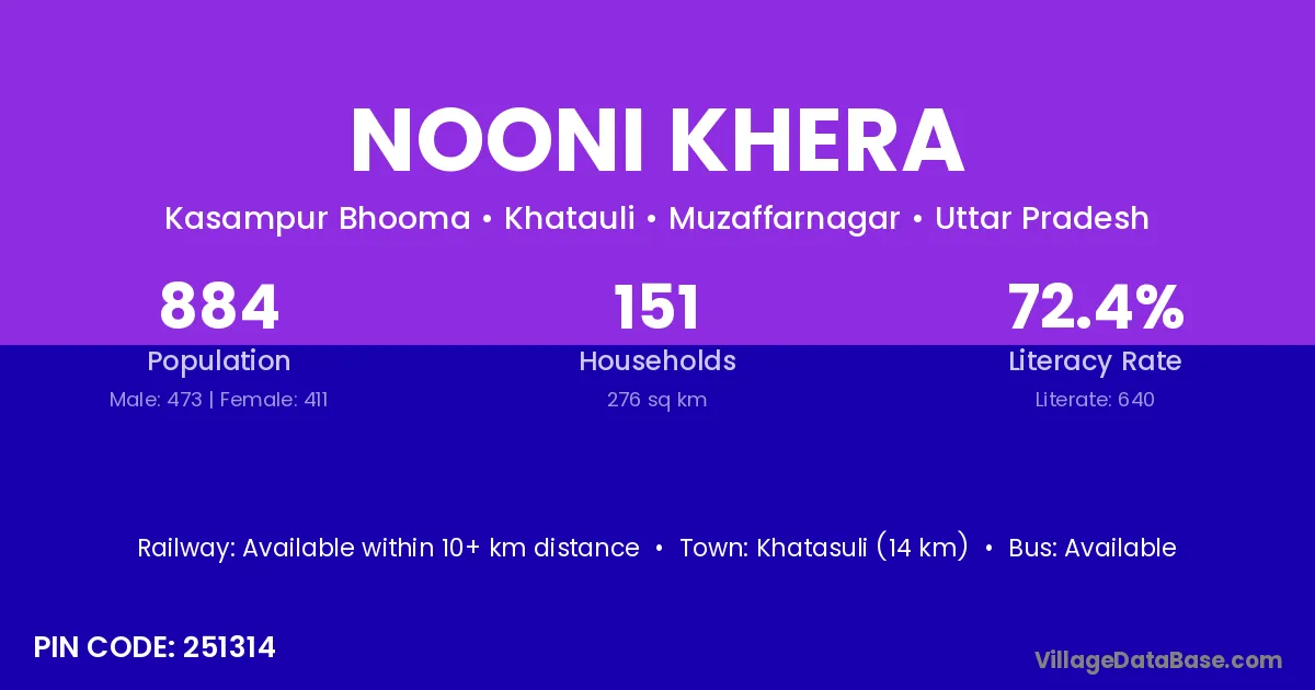 Khatasuli (14 km) is the nearest town to Nooni Khera village for major economic activities and is located approximately 14 km away.