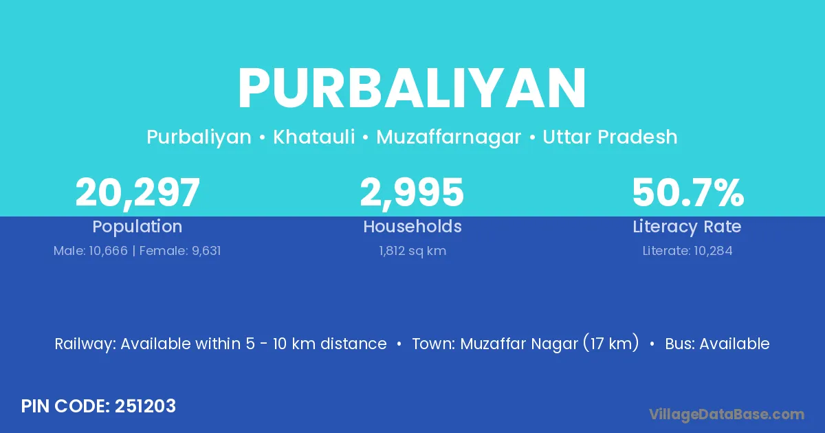 Purbaliyan village has a total population of 20,297 people, of which 10,666 are males and 9,631 are females.