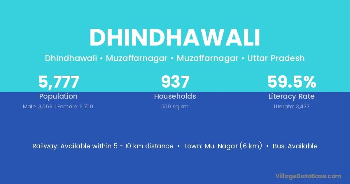 Dhindhawali village has a total population of 5,777 people, of which 3,069 are males and 2,708 are females.