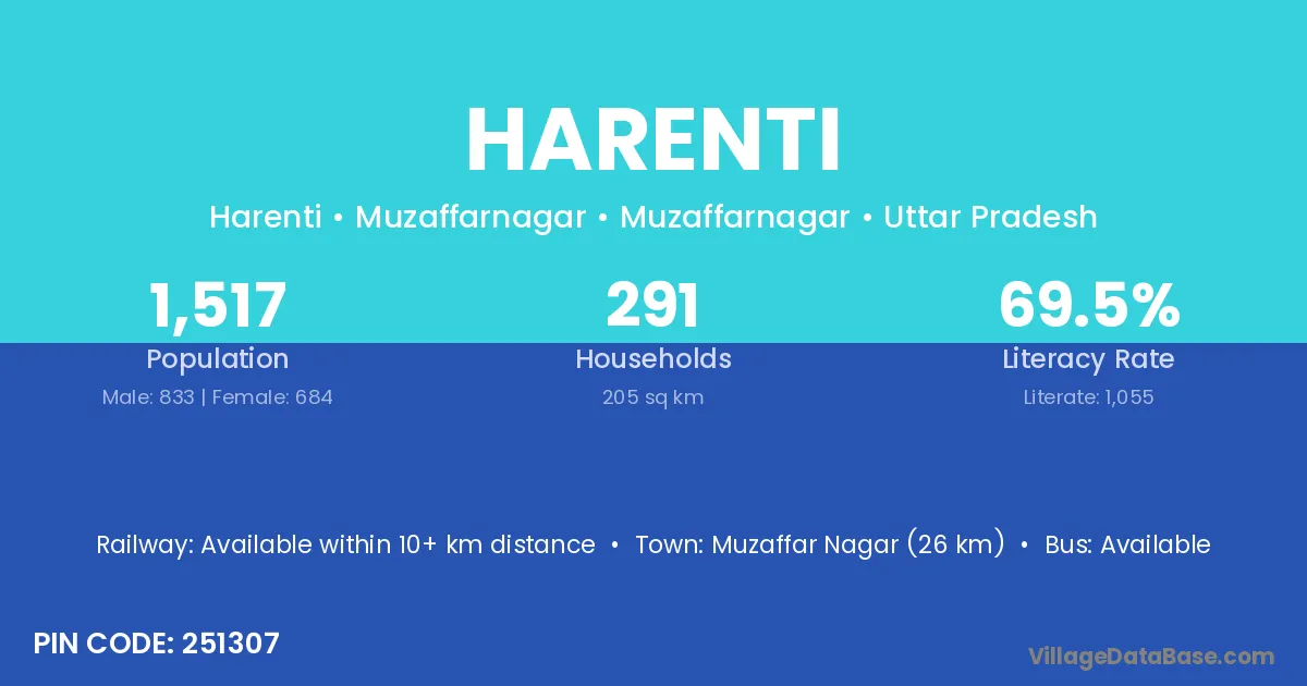 Muzaffar Nagar (26 km) is the nearest town to Harenti village for major economic activities and is located approximately 26 km away.
