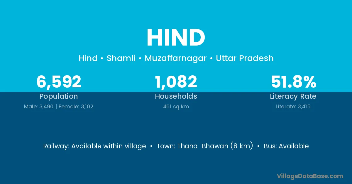 Thana Bhawan (8 km) is the nearest town to Hind village for major economic activities and is located approximately 8 km away.