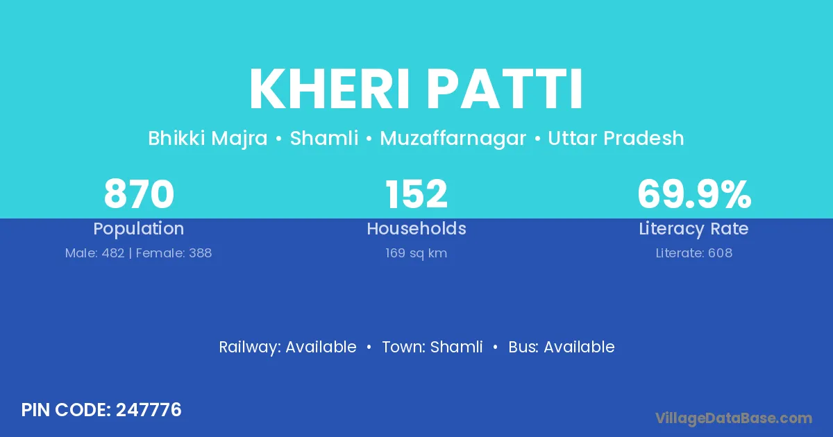 Kheri Patti village has a total population of 870 people, of which 482 are males and 388 are females.