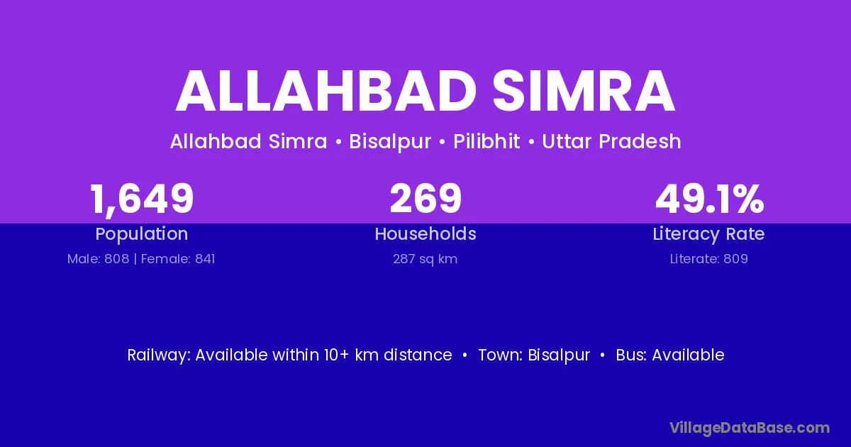 Allahbad Simra village has a total population of 1,649 people, of which 808 are males and 841 are females.