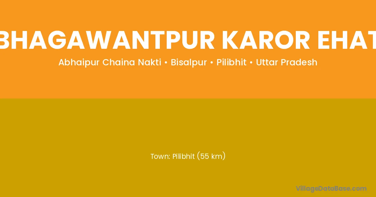 Pilibhit (55 km) is the nearest town to Bhagawantpur Karor Ehat village for major economic activities and is located approximately 55 km away.